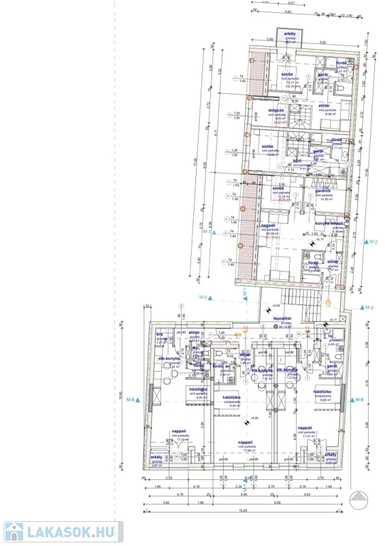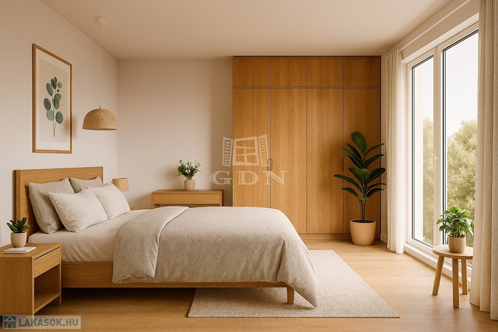 A lakásban az alsó szinten egy tágas közösségi tér (nappali-konyha-étkező), előtér és mellékhelyiség kerül kialakításra, míg a felső szinten két szoba, gardróbszoba és fürdőszoba kap teret. Igény esetén a lakásban egy további szoba is kialakítható. A lakás nappalijából egy méretes 17 m2-es erkély, míg a felső szinten az egyik szobából 3 m2-es erkély nyílik a zölddel borított udvarra.