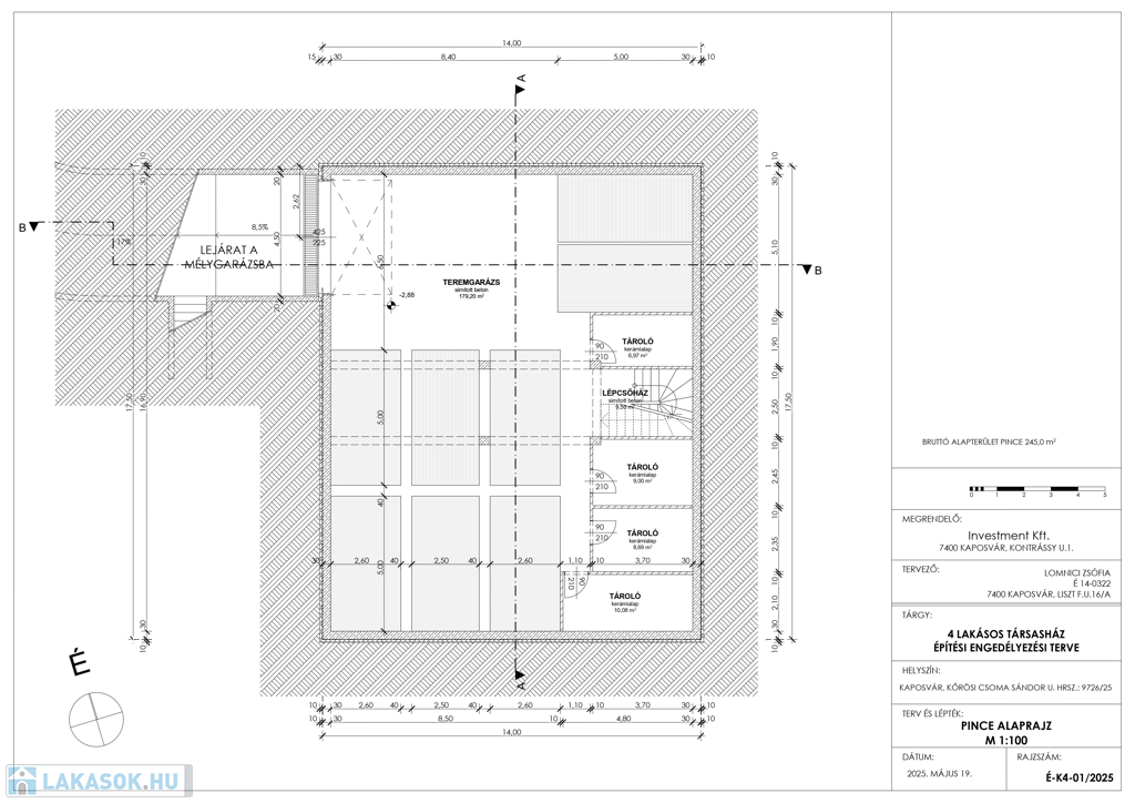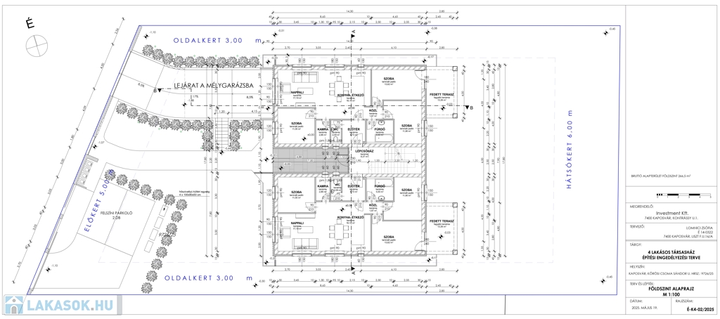 Kaposváron a Kecelhegyi városrészben, a Kőrösi Csoma Sándor utcában, új építésű, exkluzív - magas minőségben kivitelezett, korszerű építőanyagokból épülő, energiatakarékos társasházban - 4 db lakás eladó. A társasház földszintjén 2 db 97,91 m2-es lakás, míg az 1. emeleten 2 db 96,13 m2-es lakás kerül kialakításra. Minden lakásban előszoba, nappali - terasz vagy erkély - konyha, 3 szoba, fürdőszoba-wc helyiség lesz kialakítva, továbbá minden lakáshoz megvásárolható önálló tároló és egy felszíni parkoló, illetve a mélygarázsban 2 db beálló, elektromos autótöltővel. A kerítés kialakítása oly módon történik, hogy a felszíni parkolót kapunyitás nélkül is meg lehessen közelíteni. A korszerű, modern energetikájú - ezáltal alacsony rezsivel rendelkező - épület fűtése és hűtése levegő-víz hőszivattyúval lesz biztosítva, igény szerint napelemes támogatással, továbbá fan-coil rendszer szolgáltatja az igényelt hőmérsékletet a lakásban. A hőszigetelt faszerkezetű nyílászárókhoz igény szerint zsaluziák lesznek felszerelve, illetve prémium minőségű szaniterek és szerelvények, illetve csapok kerülnek beépítésre. A megállapodás szerint a konyhabútort (bútorlapból) igény esetén az eladó fogja legyártatni, amelyre a felek külön megállapodást kötnek. A lakáshoz tartozó önálló udvar mérete lakásonként 200 m2. A lakások az ideális lokáció miatt jó választás lehet családoknak és befektetőknek egyaránt - élelmiszerbolt, iskola, óvoda és buszmegálló gyalogos távolságban percek alatt elérhető. Az épület teljes kivitelezése és a műszaki átadása várhatóan 2026. IV. negyedévben történik meg.Energetikai besorolás: A