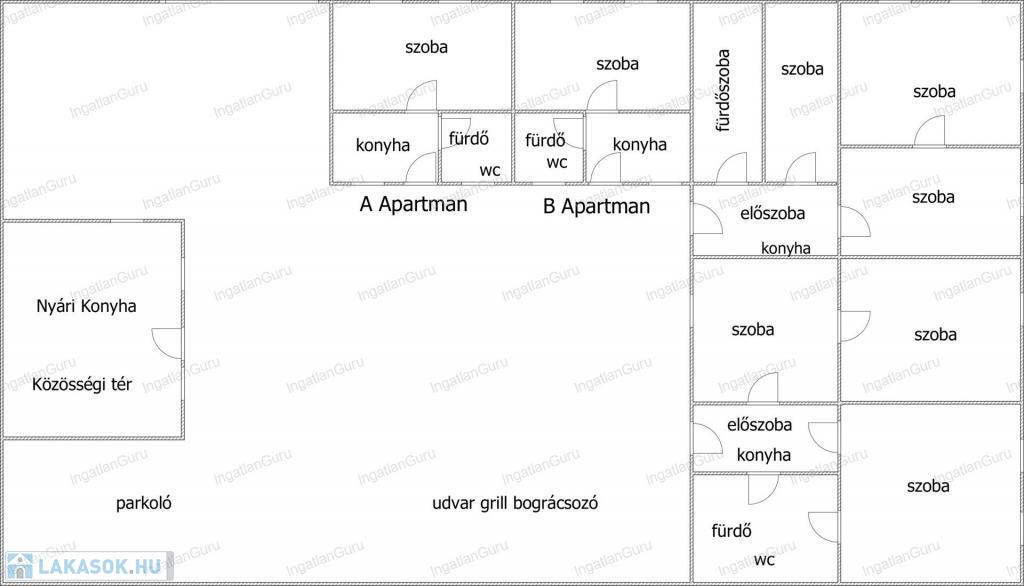 A 3 lakásból 2 teljesen egyforma paraméterekkel és felszereltséggel rendelkezik. Mind a kettőben 3 szoba található. Az alaprajzon látható 1-es lakás 2 külön bejáratú apartmanra lett bontva, mind a kettő apartman saját fürdőszobával és konyhával rendelkezik.