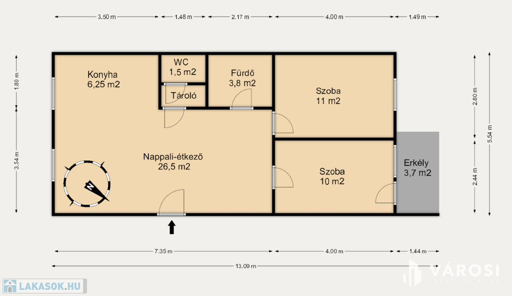 Praktikus elrendezésű, található benne 2 kényelmes szoba, egy tágas nappali-étkező-konyha, amely ideális a hétköznapi főzésekhez és baráti összejövetelekhez egyaránt, a külön fürdőszoba és WC pedig megkönnyíti a mindennapokat.