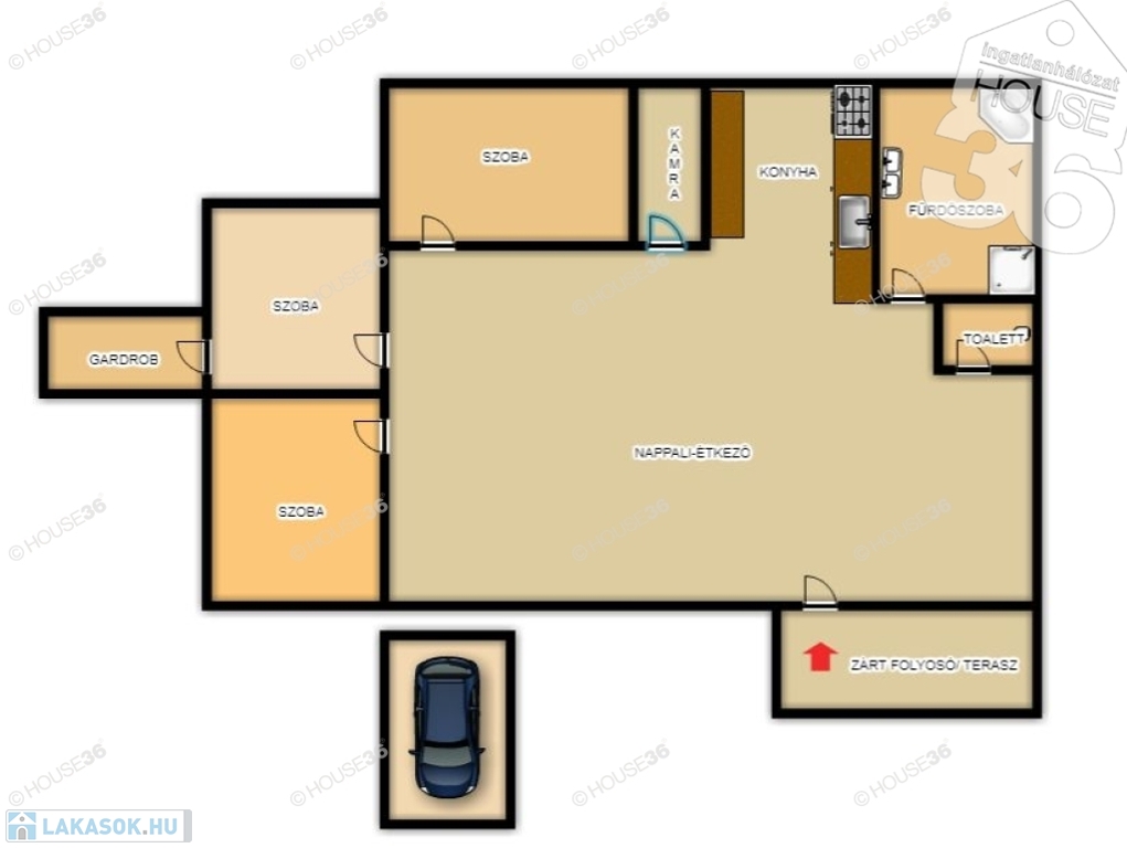 Nappali + 3 szoba + gardrób + garázs!