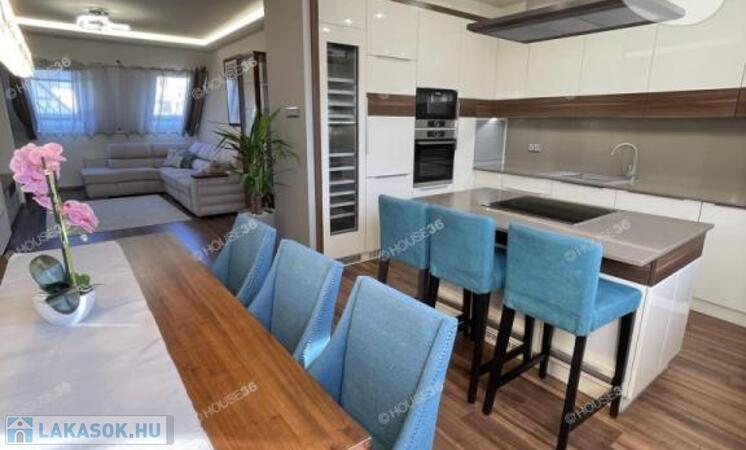 Nappali + 3 szoba, garázs, fürdő, tágas nappali étkező, amerikai konyha.