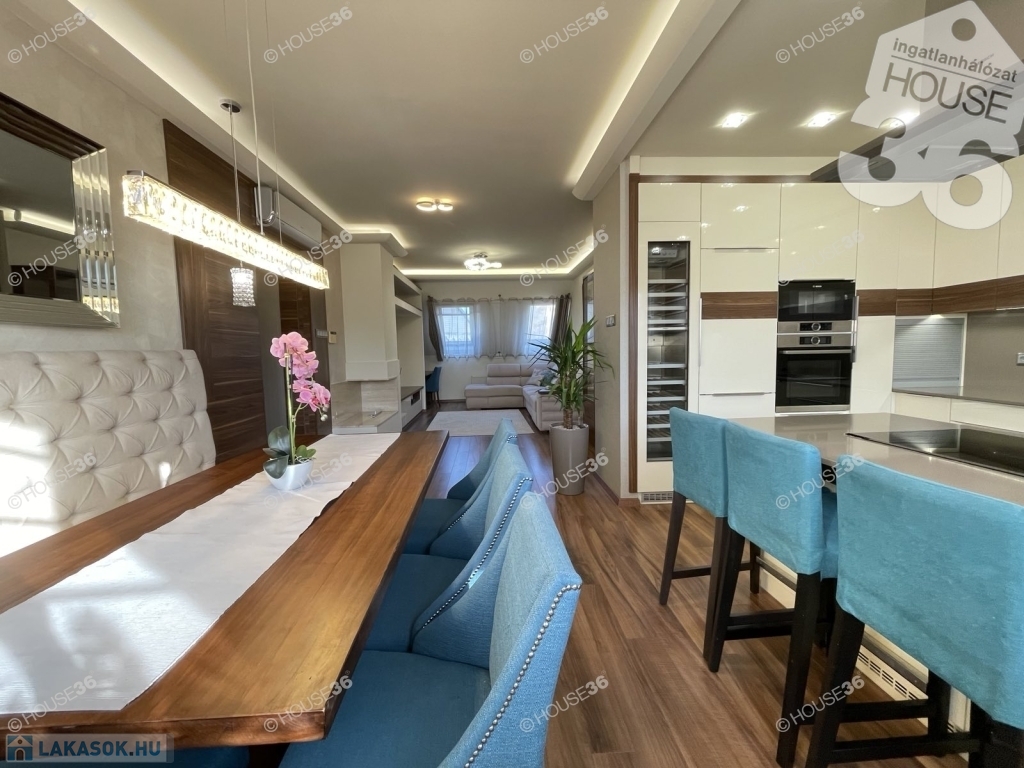 Nappali + 3 szoba, garázs, fürdő, tágas nappali étkező, amerikai konyha.