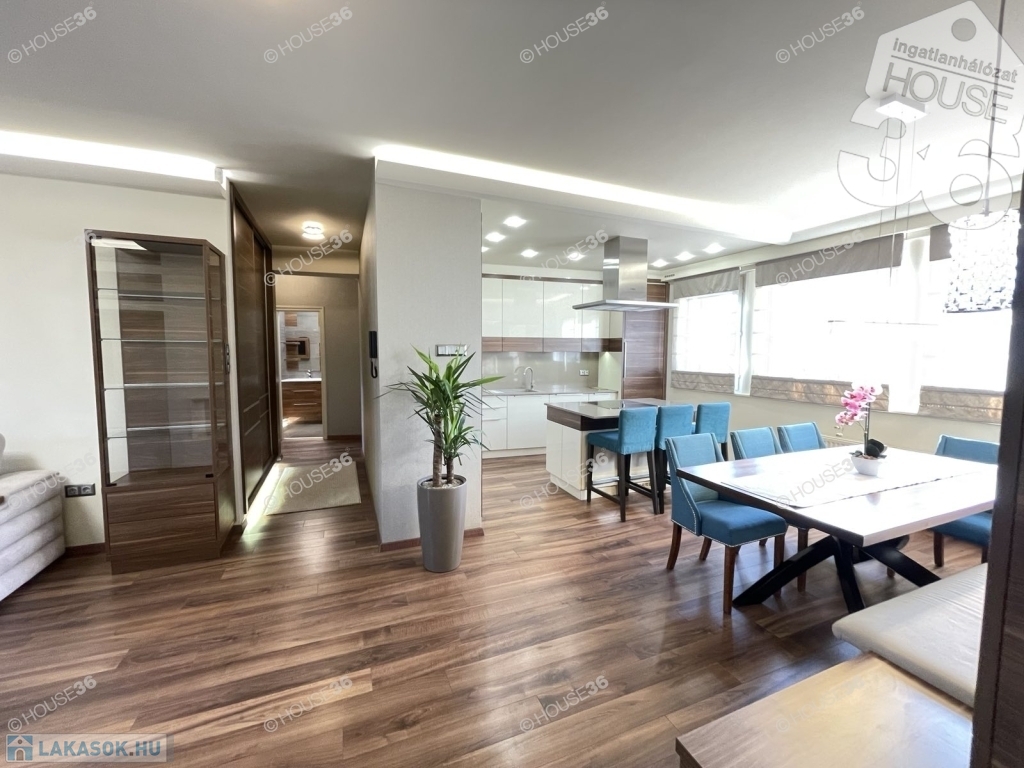 A lakás bruttó 93 m2, lakberendező által kialakított, prémium minőségű, ottmaradó beépített stílusos, egységes bútorzattal, magas színvonalú gépekkel felszerelve!