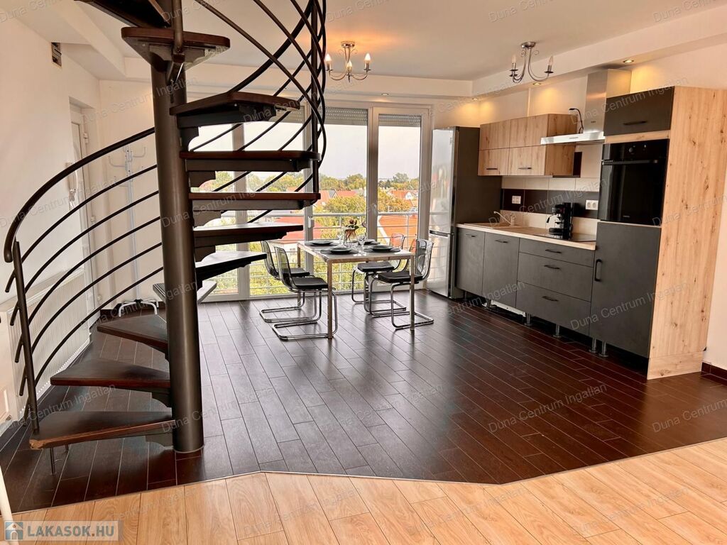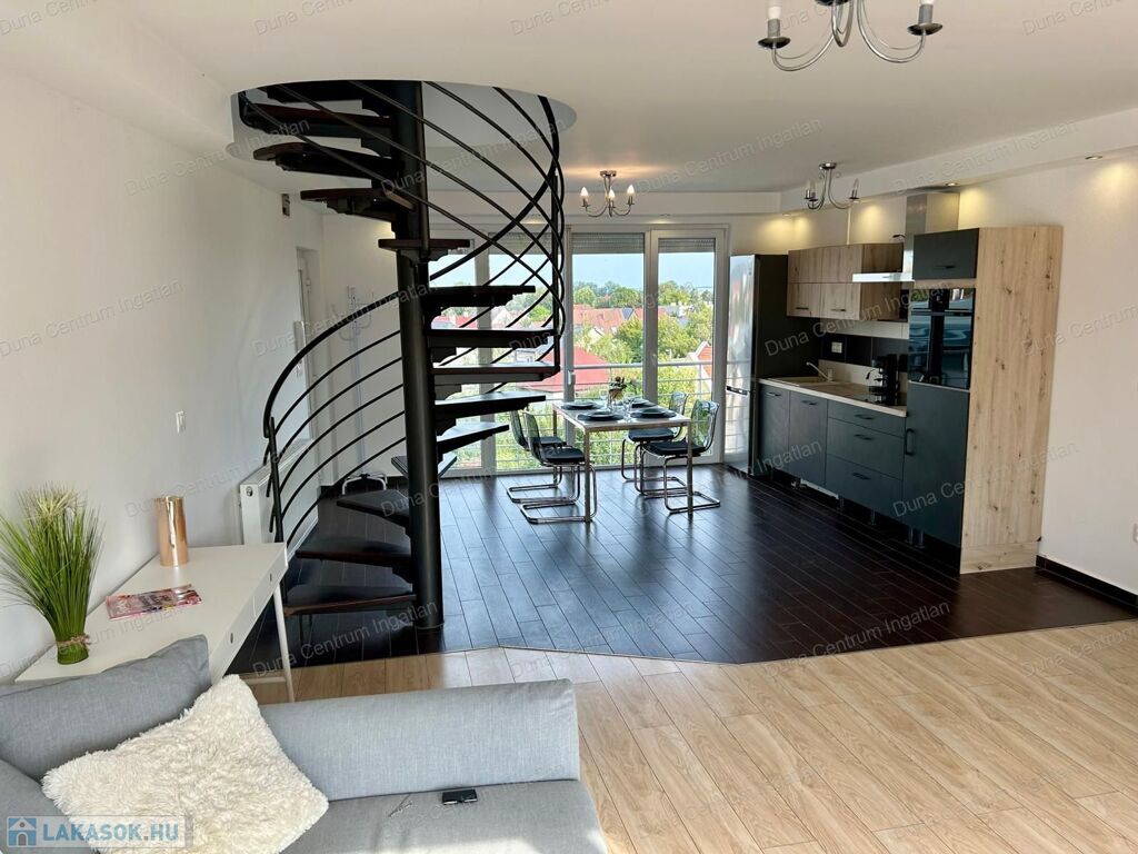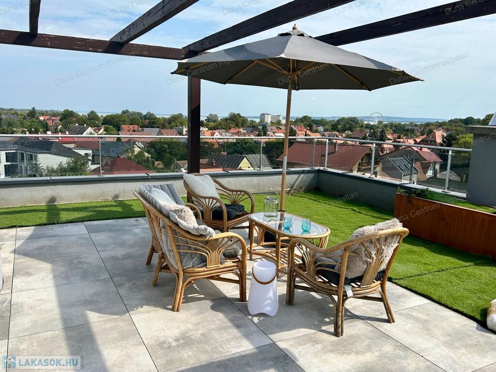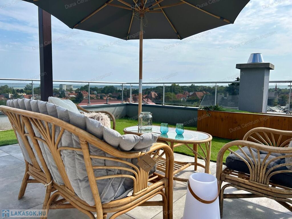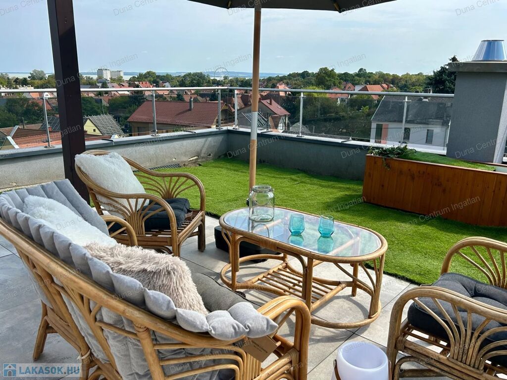 Keszthelyen páratlan elhelyezkedésű, Balatoni panorámás , tetőtertaszos lakás eladó. Az ingatlanban tágas, világos nappali, konyha-étkező, kettő szoba, fürdőszoba, wc kapott helyet. A tetőterasz csigalépcsője a nappaliból indul, a terasz a lakás teljes alapterülete fölé épült, ahonnan a Keszthelyi hegységet-Balatont-Óvárost körül ölelő panoráma tárul elénk. A fűtést és meleg víz ellátását kombi gázkazán biztosítja. A ház belső udvara parkosított, térkövezett, itt található az ingatlanhoz tartozó parkolóhely is.