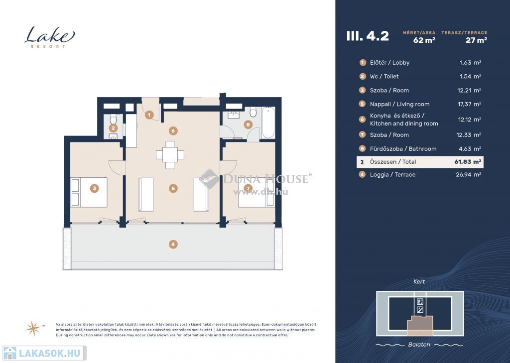 A Lake Resort lakópark Keszthely centrumától délre található Helikon ligetben, a Balaton nyugati oldalán, partközelségben természet közeli környezetben a volt Zala Kemping és Üdülőfalu területén helyezkedik el. Az ingatlan előtt húzódó Entz Géza sétány kerékpárútban végződik, ezáltal az ingatlan zárt szakaszon biztosítja a lakók személygépkocsival való bejutását. A 7,2 hektár nagyságú telek Balaton felőli oldalán ősfás parkosított szakasz nyúlik, a vízparton való pihenéshez, horgászathoz közvetlen móló vagy stég áll rendelkezésre. A déli oldalon húzódó zöld övezet a túrázni, sportolni vágyóknak és kis házi kedvencekkel való sétáláshoz ad tökéletes helyszínt. A tömb északi oldalán a Helikon Horgász Egyesület helyezkedik el.A Lake Resort, projektünk első ütemében 5, a második ütemben 7 házból álló 288 lakásos lakópark kerül kialakításra. A projekt első üteme 2022 első negyedévében kezdődött, kulcsrakész okos megoldással kialakított lakások műszaki átadása 2023 negyedik negyedévétől veszi kezdetét. A telek adta méreteinek és ősfás területének köszönhetően, gondozott parkok, játszó- és sport kertek, tanösvények, piknik/grillezéshez kialakított helyek, privát medencék és saját móló/stég nyújtanak felemelő kikapcsolódási élményeket. A területen megvalósuló Lake Resort lakópark a hely kiemelkedő adottságait kihasználva, könnyed, látványos építészeti megjelenésével harmonikus lakókörnyezetet teremt. Az épületek az Entz Géza sétány felől egy távirányítós rendszerrel ellátott sorompós behajtón, illetve személybejárón keresztül közelíthetőek meg. A lakóházak földszintjén fedett garázs, elektromos autótöltési lehetőség, zárt bicikli és egyéb tárolók találhatók. Az épületek aljában kereskedelmi és szolgáltatóegységek kerülnek kialakításra. A stúdió, közepes és deluxe méretű lakások elsőtől harmadik emeletig szintenként 7-7 lakással, saját erkéllyel lettek tervezve, a felső negyedik szinten pedig összesen három, két penthouse és egy közepes méretű lakás kap helyet privát teraszokkal. Lakásaink között elérhető 30 m2-től akár 150 m2-ig, melyek hozzájárulnak a minőségi életvitelhez és a gondtalan pihenéshez. A Lake Resort Lakópark négy szinten három különféle méretű lakást kínál az érdeklődők számára. Célunk, olyan lakások, otthonok és nyaralók kivitelezése, melyek erkéllyel/terasszal, klimatizált, prémium minőségű alapanyagokkal, modern 21. századi műszaki technológiával épülnek. Valamennyi lakáshoz földszinti fedett garázs és tároló is igény szerint vásárolható. Igényeihez igazodó lakását még ma találja meg, további kérdéseivel keressen bizalommal.