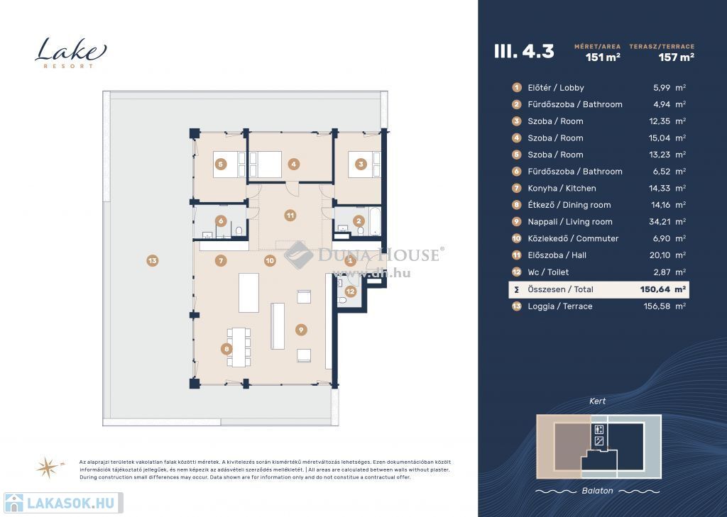 A Lake Resort lakópark Keszthely centrumától délre található Helikon ligetben, a Balaton nyugati oldalán, partközelségben természet közeli környezetben a volt Zala Kemping és Üdülőfalu területén helyezkedik el. Az ingatlan előtt húzódó Entz Géza sétány kerékpárútban végződik, ezáltal az ingatlan zárt szakaszon biztosítja a lakók személygépkocsival való bejutását. A 7,2 hektár nagyságú telek Balaton felőli oldalán ősfás parkosított szakasz nyúlik, a vízparton való pihenéshez, horgászathoz közvetlen móló vagy stég áll rendelkezésre. A déli oldalon húzódó zöld övezet a túrázni, sportolni vágyóknak és kis házi kedvencekkel való sétáláshoz ad tökéletes helyszínt. A tömb északi oldalán a Helikon Horgász Egyesület helyezkedik el.A Lake Resort, projektünk első ütemében 5, a második ütemben 7 házból álló 288 lakásos lakópark kerül kialakításra. A projekt első üteme 2022 első negyedévében kezdődött, kulcsrakész okos megoldással kialakított lakások műszaki átadása 2023 negyedik negyedévétől veszi kezdetét. A telek adta méreteinek és ősfás területének köszönhetően, gondozott parkok, játszó- és sport kertek, tanösvények, piknik/grillezéshez kialakított helyek, privát medencék és saját móló/stég nyújtanak felemelő kikapcsolódási élményeket. A területen megvalósuló Lake Resort lakópark a hely kiemelkedő adottságait kihasználva, könnyed, látványos építészeti megjelenésével harmonikus lakókörnyezetet teremt. Az épületek az Entz Géza sétány felől egy távirányítós rendszerrel ellátott sorompós behajtón, illetve személybejárón keresztül közelíthetőek meg. A lakóházak földszintjén fedett garázs, elektromos autótöltési lehetőség, zárt bicikli és egyéb tárolók találhatók. Az épületek aljában kereskedelmi és szolgáltatóegységek kerülnek kialakításra. A stúdió, közepes és deluxe méretű lakások elsőtől harmadik emeletig szintenként 7-7 lakással, saját erkéllyel lettek tervezve, a felső negyedik szinten pedig összesen három, két penthouse és egy közepes méretű lakás kap helyet privát teraszokkal. Lakásaink között elérhető 30 m2-től akár 150 m2-ig, melyek hozzájárulnak a minőségi életvitelhez és a gondtalan pihenéshez. A Lake Resort Lakópark négy szinten három különféle méretű lakást kínál az érdeklődők számára. Célunk, olyan lakások, otthonok és nyaralók kivitelezése, melyek erkéllyel/terasszal, klimatizált, prémium minőségű alapanyagokkal, modern 21. századi műszaki technológiával épülnek. Valamennyi lakáshoz földszinti fedett garázs és tároló is igény szerint vásárolható. Igényeihez igazodó lakását még ma találja meg, további kérdéseivel keressen bizalommal.