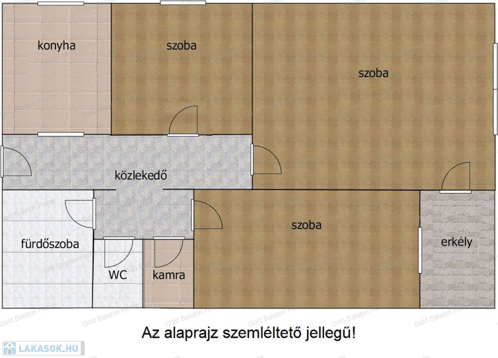 Lakás helyiségei: három szoba, konyha étkezővel, közlekedő, fürdőszoba, külön WC, kamra, erkély.