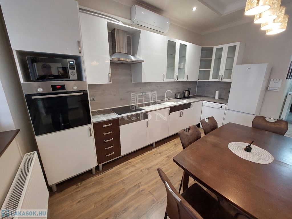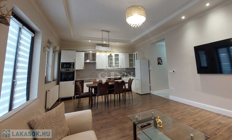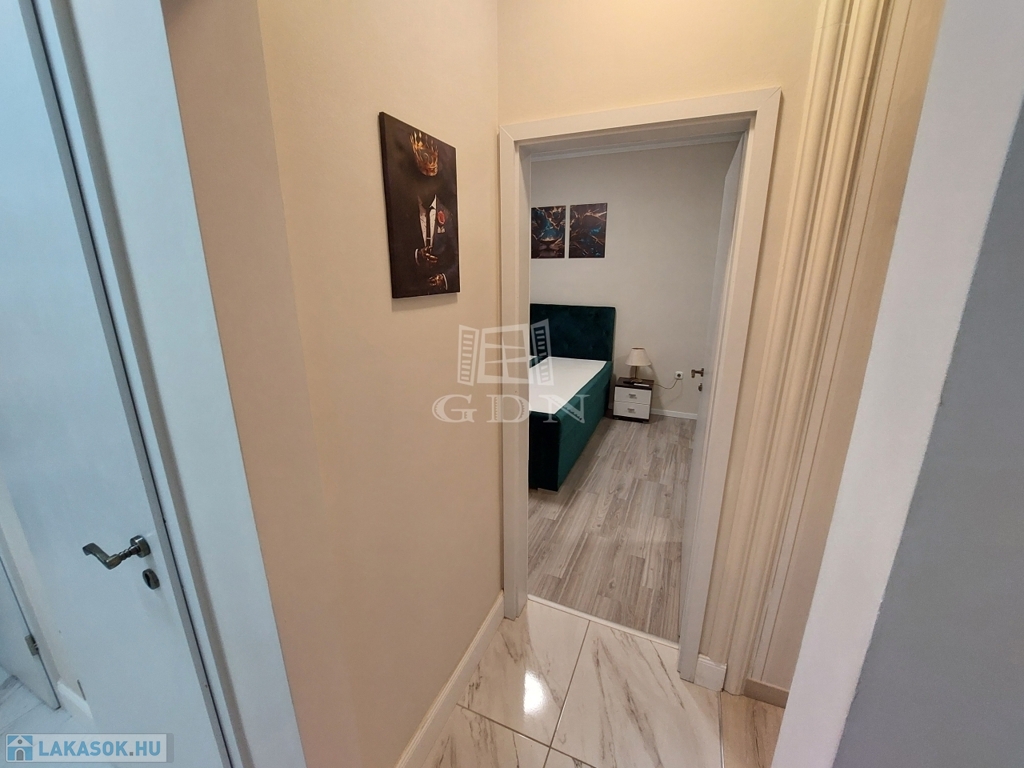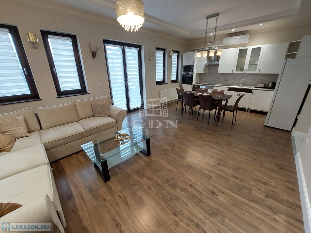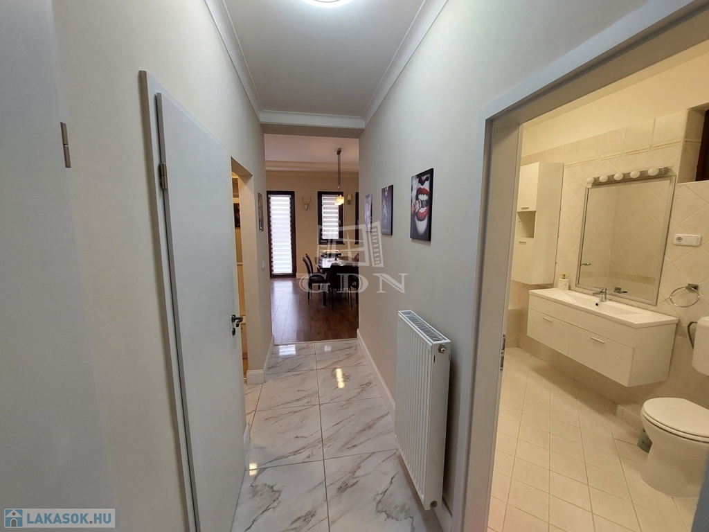A belső elrendezés minden részlete tudatos tervezés eredménye. Az előtérből külön vendég WC nyílik, valamint egy exkluzív fürdőszoba, ahol wc, kád és zuhany is rendelkezésre áll. A hálószobában egyedi, tükörajtós beépített gardrób teszi izgalmassá a teret és biztosítja a maximális kényelmet. Innen tárul fel a lakás reprezentatív központja: a nagyvonalú, amerikai konyhás nappali–étkező, amely tökéletes teret ad elegáns vendéglátáshoz és meghitt mindennapokhoz egyaránt.