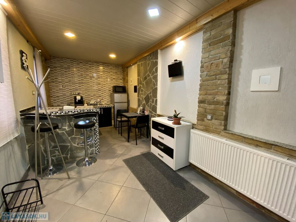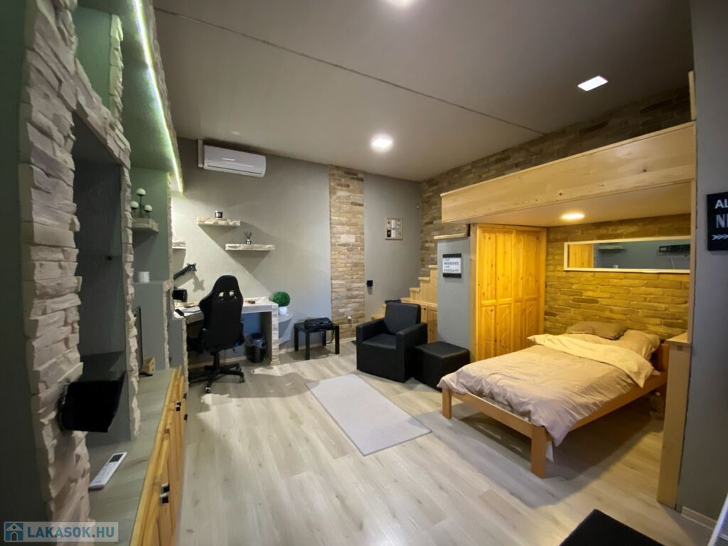 Az ingatlanban található egy fürdőszoba zuhanyzóval, wc-vel; étkező-konyha egybenyitva; egy szoba, melyben galériás megoldással került kialakításra a hálórész.