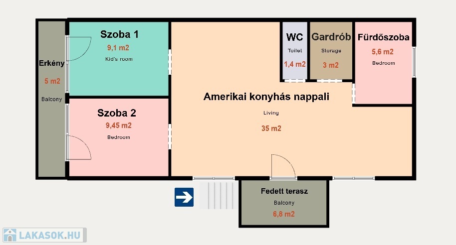 A lakótérben kialakításra került 2 szoba, amerikai konyhás nappali, fürdő, külön wc és egy gardrób szoba. Az épülethez tartozik egy dupla pince, mely 42 m2+20 m2, egy 5 m2-es erkély és egy közel 7 m2-es fedett terasz.