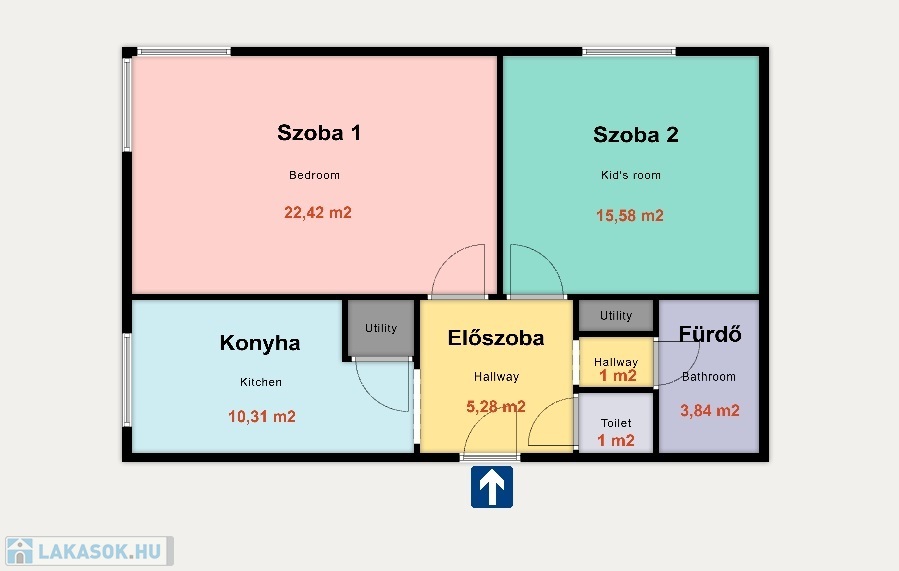 - Szobák: 2 db (22,42 és 15,58 m2)