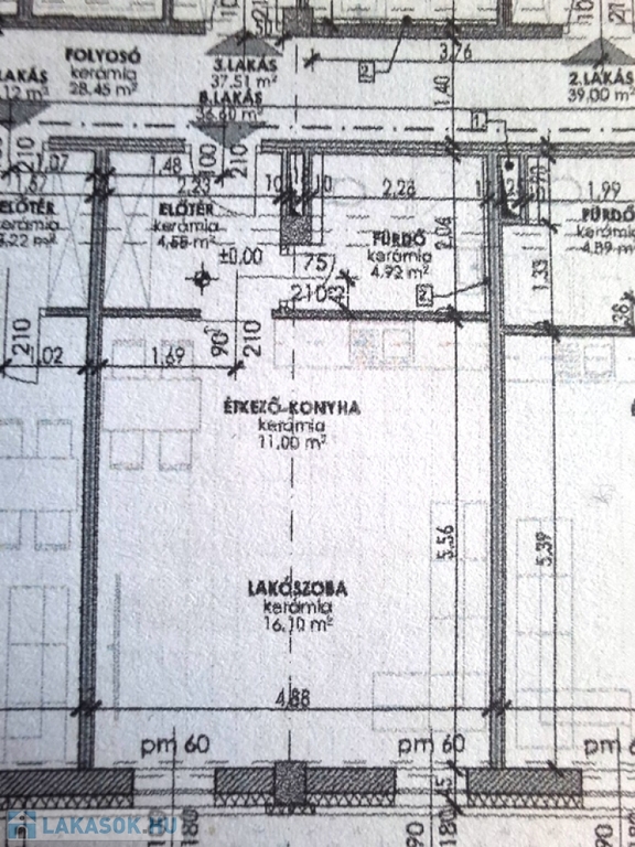 A lakás 36,60 nm, helyiségei:előtér 4,68 nm, fürdőszoba 4,92 nm, étkező/konyha 11,00 nm, nappali/lakószoba 18,10 nm.