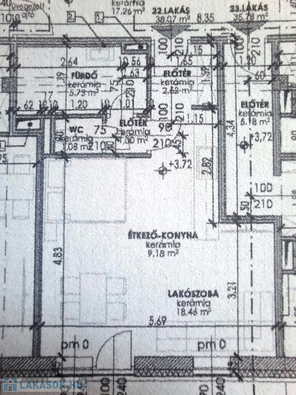 A lakás 38,07 nm, helyiségei:előtér 2,62 nm, fürdőszoba 5,75nm, lakószoba 18,46 nm, étkező/konyha 5,18 nm, előtér 1,00 nm wc 1,08 nm.