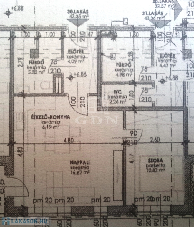 A lakás nettó 43,05 nm, helyiségei:előtér 4,09 nm, fürdőszoba 5,32 nm, étkező/konyha 6,19 nm, nappali/lakószoba 16,62 nm, szoba 10,53 nm, terasz 3,14 nm.