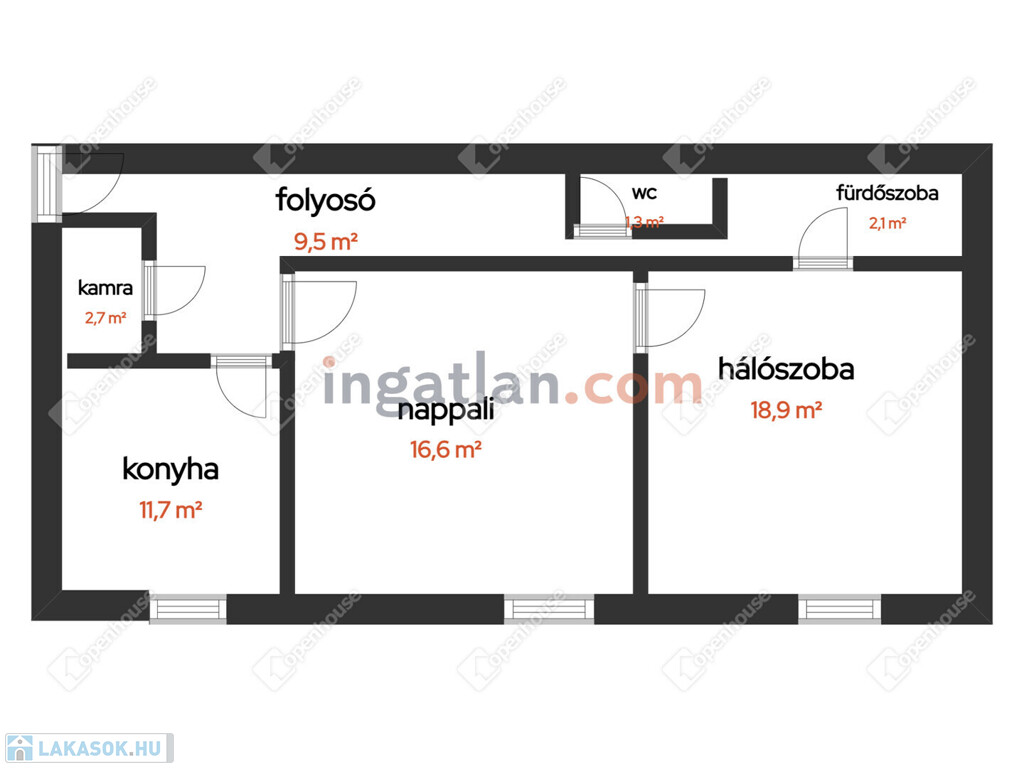 A lakás két tágas szobával, külön konyhával, fürdőszobával, külön WC-vel, kamrával, közlekedővel, rendelkezik.