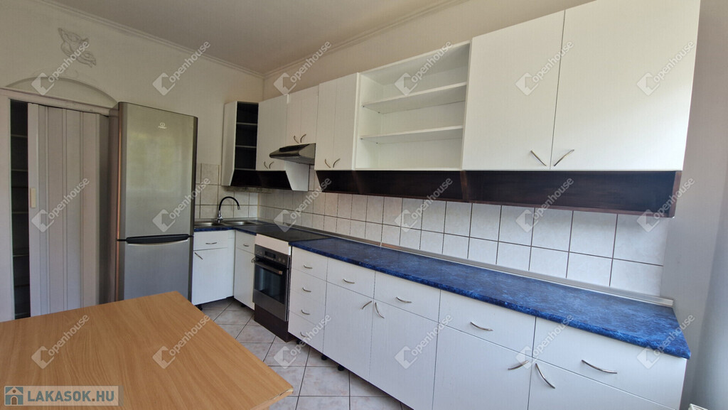A kamra és a beépített konyha praktikus megoldásokat kínál a mindennapokra.