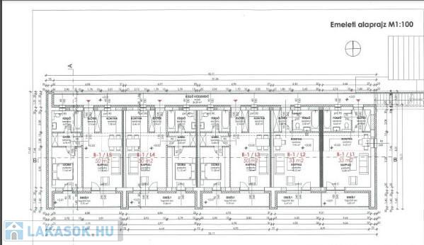A B épületben a lakóegységek többsége nappali + 1 hálószobával rendelkezik, kb. 52 m2 alapterülettel. A földszinten terasszal, kertkapcsolattal, az emeleten loggiával. Ebben az épületben összesen 9 db lakás + tároló helyiség lesz.