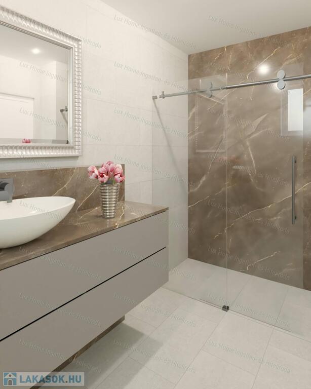 lett tervezve. A szoba laminált padlóval , a többi helyiség járólappal burkolt.
