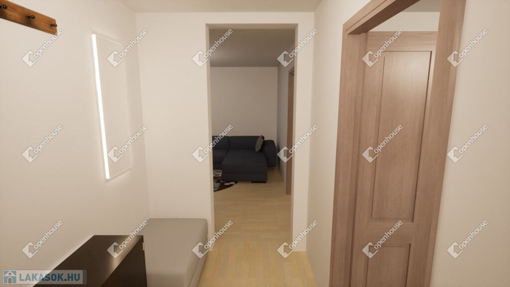 Belső elrendezése: előtér, nappali-konyha-étkező, hálószoba, fürdőszoba, erkély.