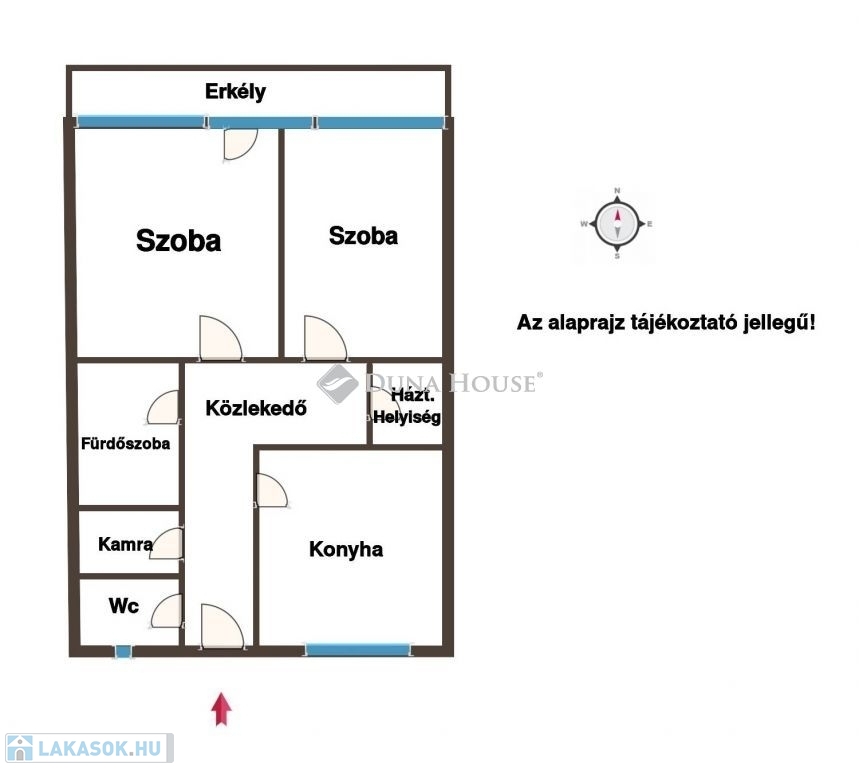 2szoba, konyha, háztartási helyiség, kamra,közlekedő, fürdőszoba, Wc.