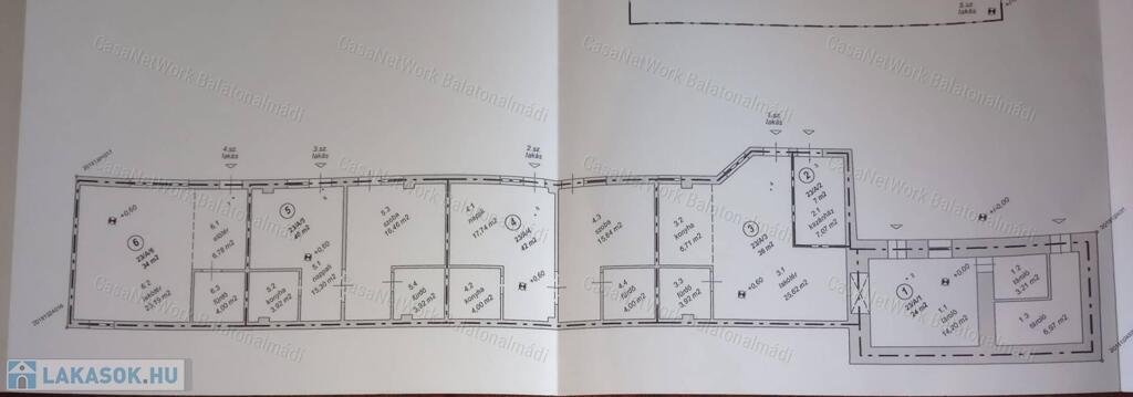 1. lakás 34 m2, 2. lakás 40 m2, 3. lakás 42 m2, 4. lakás 36 m2 kiszolgáló helyiségek: 31 m2