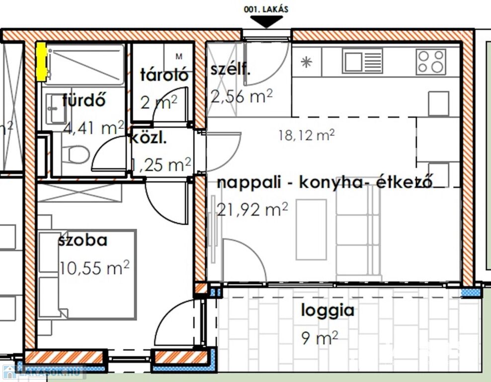 A 1 db amerikai konyhás nappalival, 1db hálószobával, 1 db fürdőszobával, közlekedővel, loggiával rendelkezik.