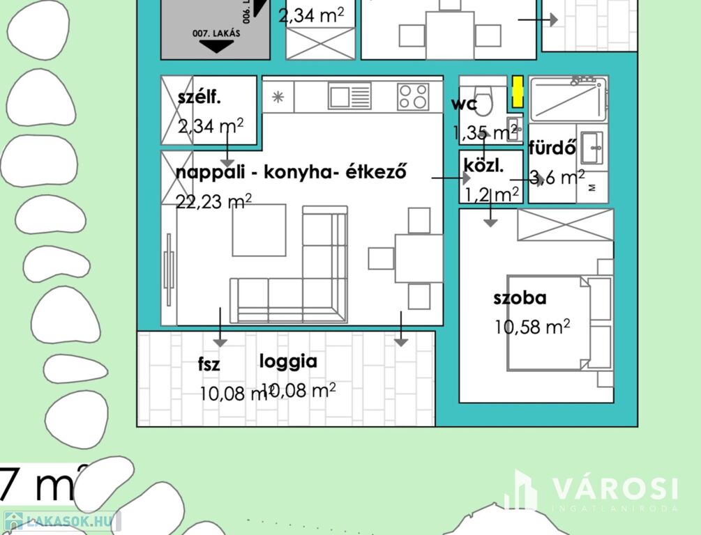 A 1 db amerikai konyhás nappalival, 1db hálószobával, 1 db fürdőszobával, közlekedővel, loggiával rendelkezik.