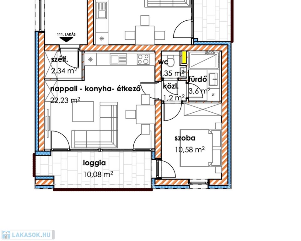 A 1 db amerikai konyhás nappalival, 1db hálószobával, 1 db fürdőszobával, közlekedővel, loggiával rendelkezik.