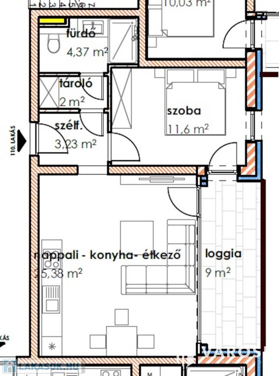 A 1 db amerikai konyhás nappalival, 1db hálószobával, 1 db fürdőszobával, közlekedővel, loggiával rendelkezik.