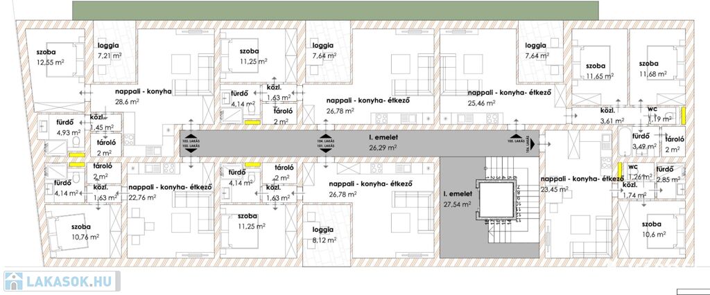 A 1 db amerikai konyhás nappalival, 1db hálószobával, 1 db fürdőszobával, közlekedővel, loggiával rendelkezik.