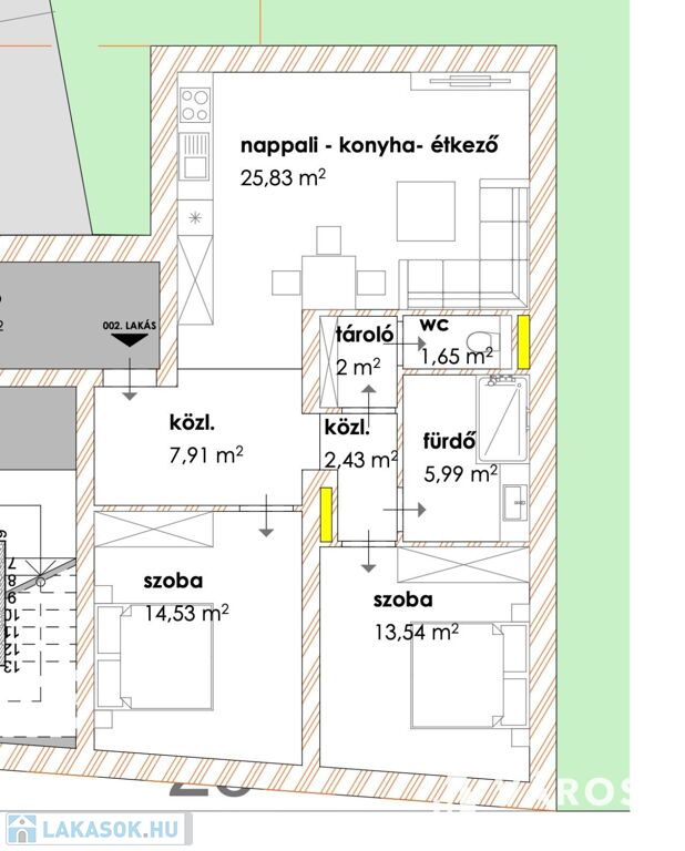 A 1 db amerikai konyhás nappalival, 2 db hálószobával, 1 db fürdőszobával, közlekedővel, loggiával rendelkezik.