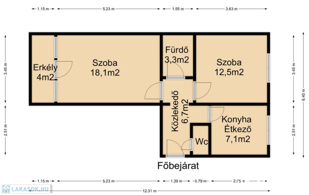 Helységek: 2 külön bejáratú szoba melyek közül a nagy szobához erkélykapcsolat is tartozik, közlekedő, fürdő, konyha, külön mellékhelység.