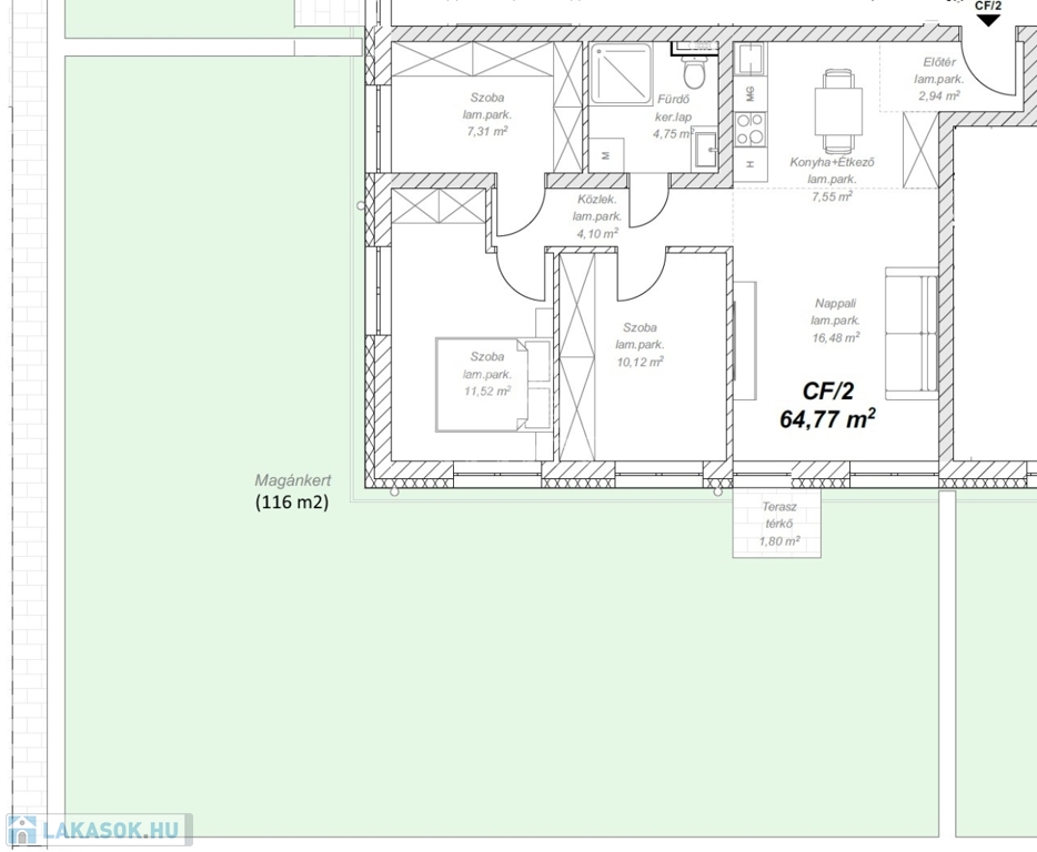 Mendén csodálatos zöld környezetben a Hétdomb lakóparkban, I. ütem második szakaszában megvalósuló új építésű zárt lakóparkban, A. kategóriás energiatakarékos ( hőszivattyús ) 16 lakásos társasházban, nettó hasznos 64,77 m² alapterületű, FÖLDSZINTI kertkapcsolatos lakást, SAJÁT 116 m² KERTRÉSSZEL kínálunk eladásra (C épület Földszint 2. Lakás).