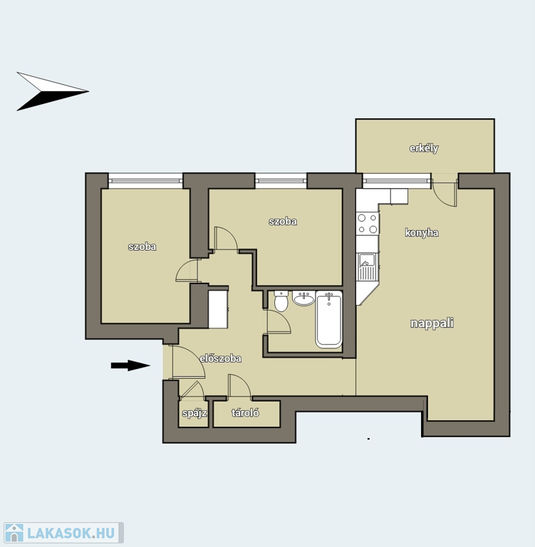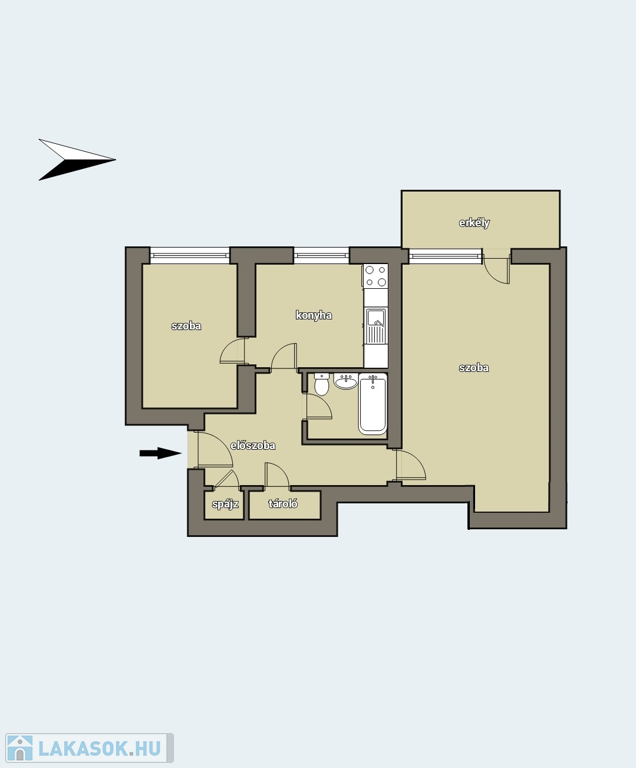 - 2 szoba, konyha-étkező, kamra, fürdőszoba WC-vel, tároló előszoba, közlekedő, pince
