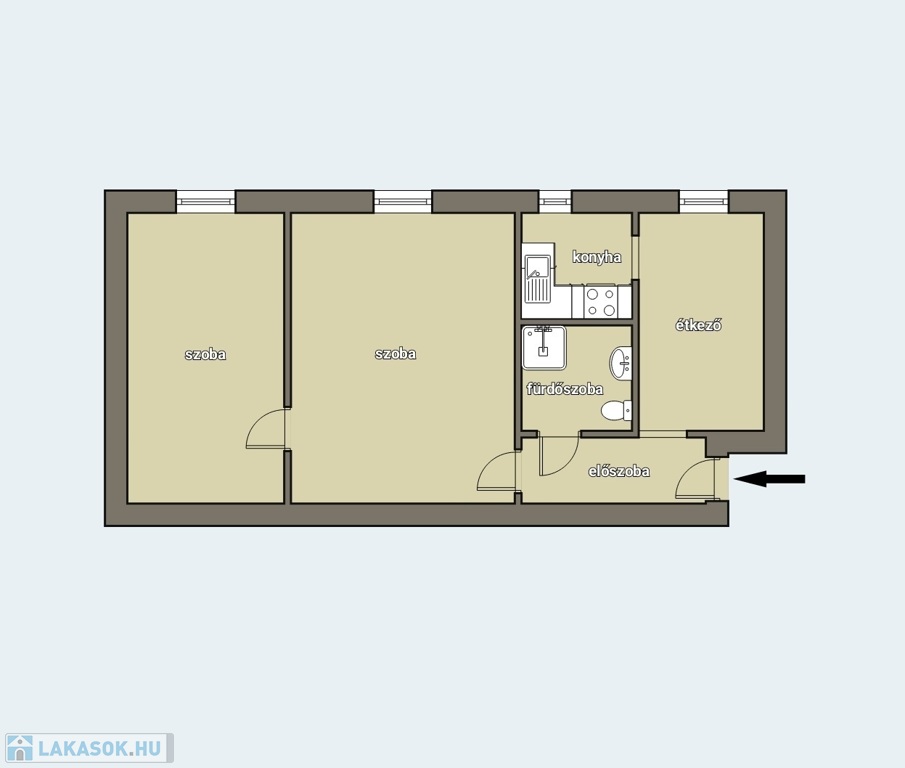 - 2 szoba, előszoba, konyha, étkező, fürdőszoba WC-vel, 4 nm-es pince