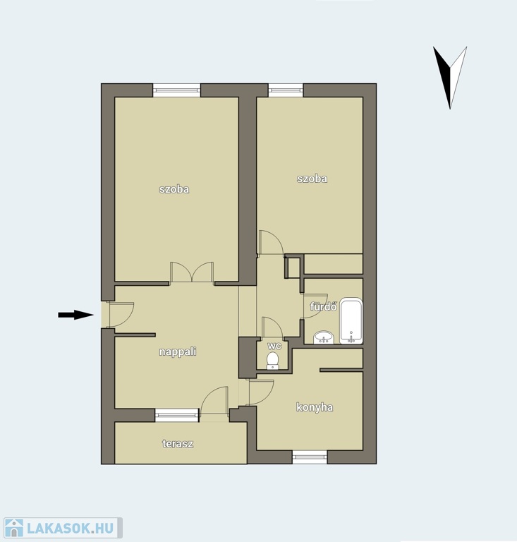 - 2 szoba+nappali, konyha, fürdőszoba, WC, előszoba, erkély, pince