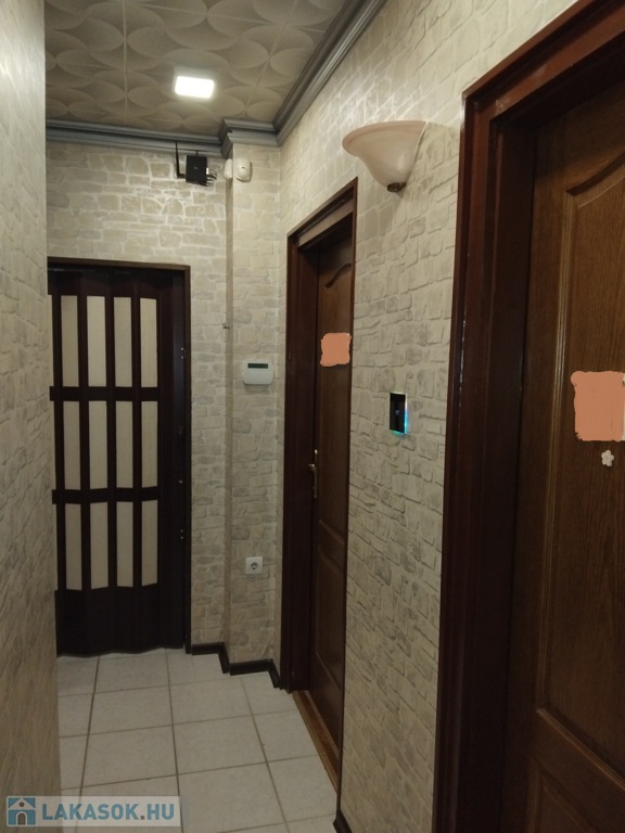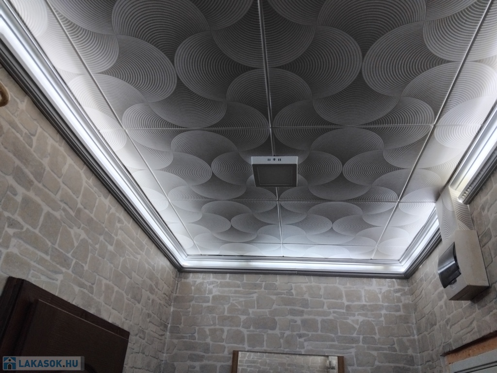 Műanyag nyílászárókkal, fém biztonsági ajtóval, teljes álmennyezettel.
