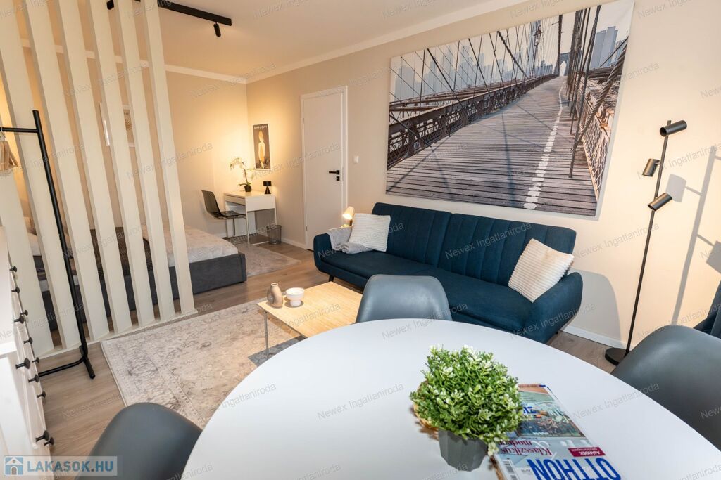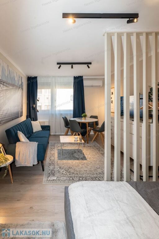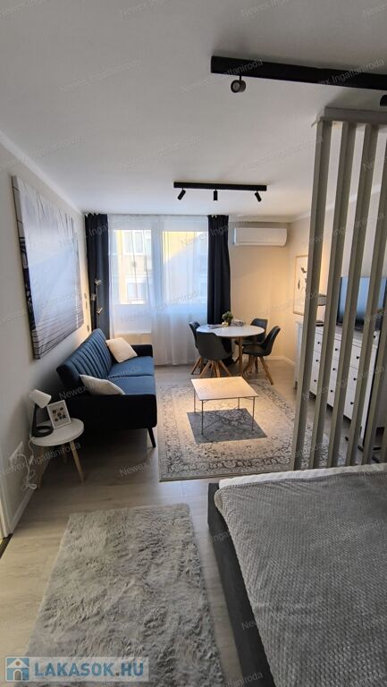 Ebben a felújított modern lakásban, jó elosztásban használhatja a 2 külön hálószekciót, a divatos térelemekkel határolt, de nyitott érzetű nappalit, az igényes zuhanykabinos fürdőszobát, valamint reggeliző sarokkal ellátott, teljesen felszerelt konyhát, az elektromos sütő és főző berendezéseket, a jégadagolós hűtőt, mely a külön nyíló kamrában került elrejtésre.