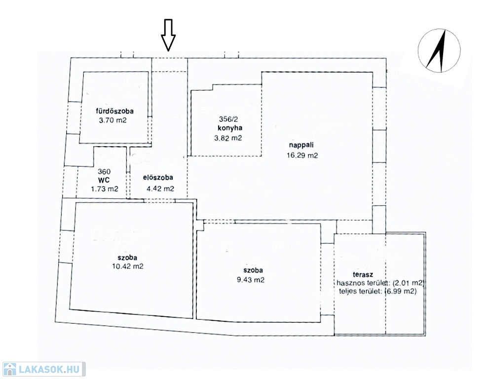 - nappali-étkező-konyha, 2 szoba, fürdőszoba, WC, terasz 6 m2, tároló 10 m2