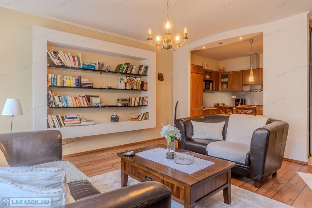 A napfényes nappali és konyha egy légtérben helyezkedik el, ami tökéletes a modern életvitelhez.