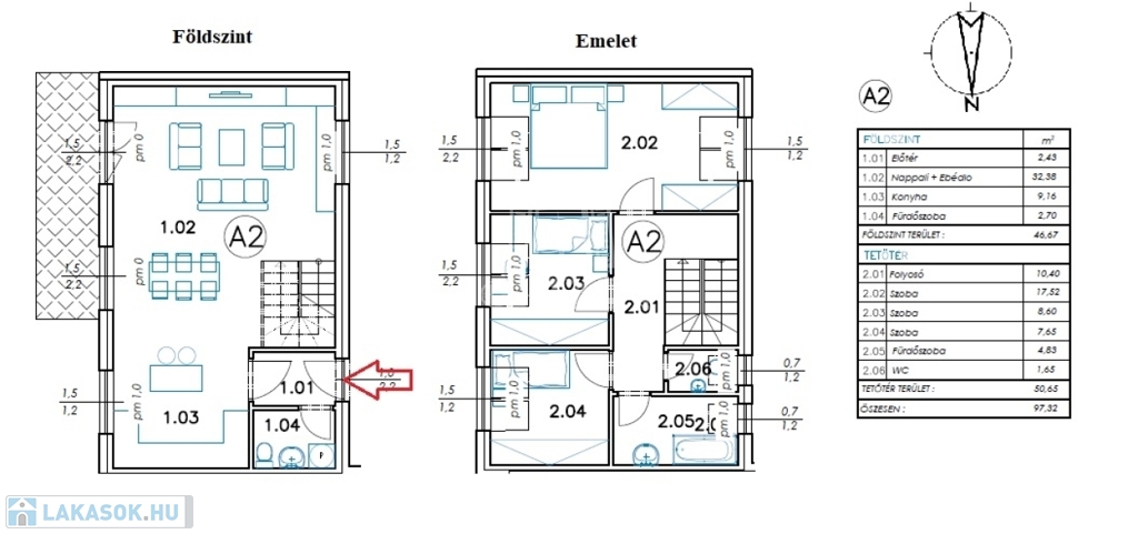 -földszinten:nappali, konyha-étkező, fürdőszoba-wc