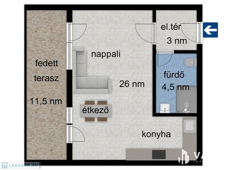- Nappali, konyha-étkező, fürdő, előtér, fedett terasz.