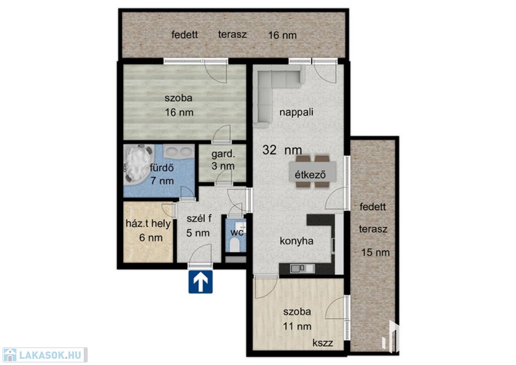 - Nappali, konyha-étkező, 2.szoba, házt.hely,gardrób, fürdő, WC, előtér, fedett terasz.