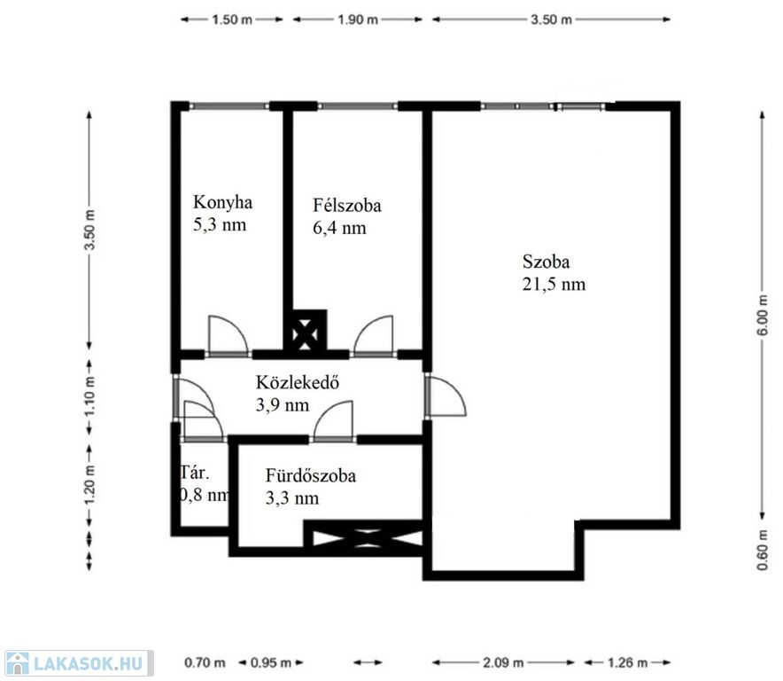 Belső lakrész helységei: közlekedő, kamra, fél szoba, szoba, konyha, fürdő mellékhelységgel együtt.