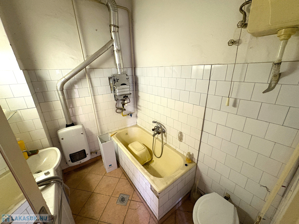 A fürdőszoba melegvíz-ellátását gázbojler biztosítja, míg a konyhában egy külön, 5 literes villanybojler áll rendelkezésre. A szobák parkettásak, a többi helyiség járólappal burkolt.