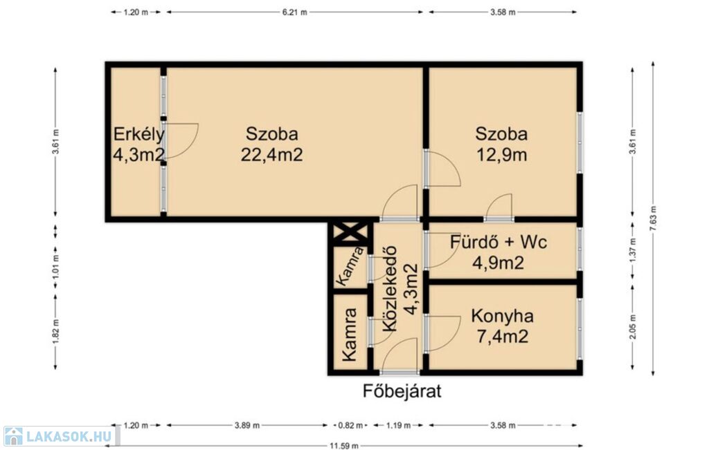 Belső lakrész helységei: nagyszoba erkélykapcsolattal, szoba, közlekedő, 2 kamra, konyha, fürdő mellékhelységgel együtt.
