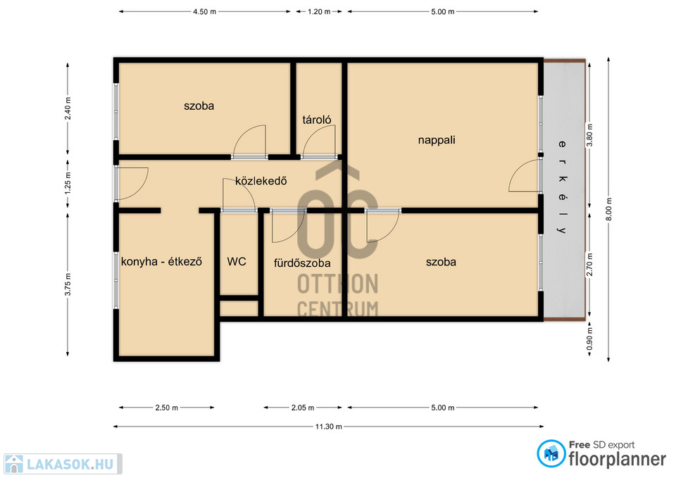 - A lakás alapterülete 63 m2 és tartozik hozzá 6 m2 terasz, mely 2 szobából megközelíthető.