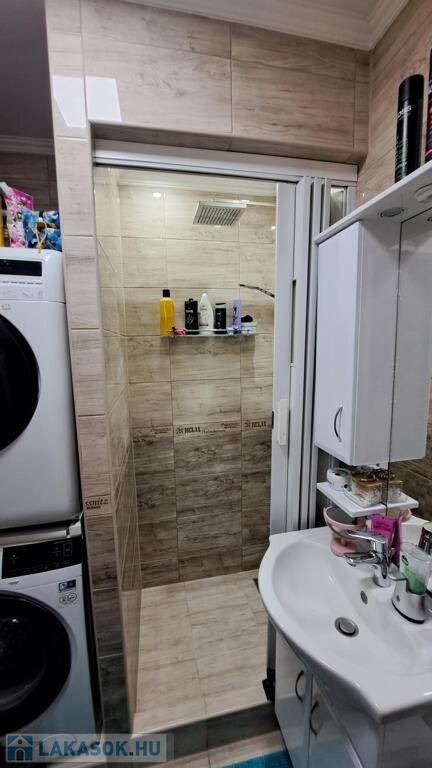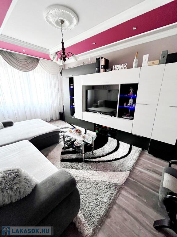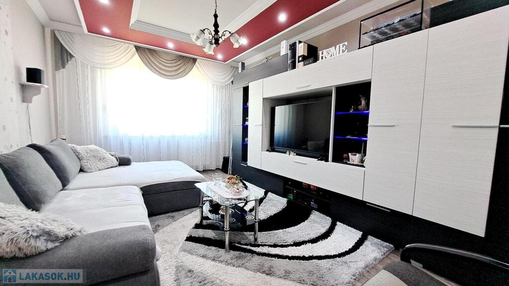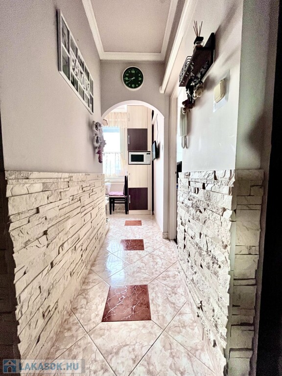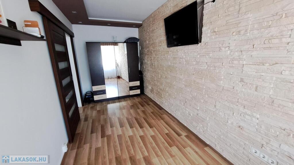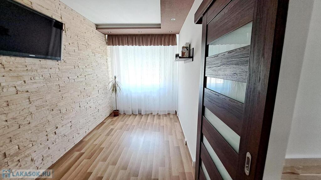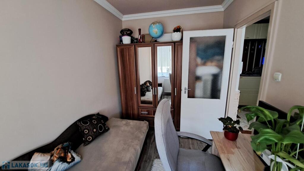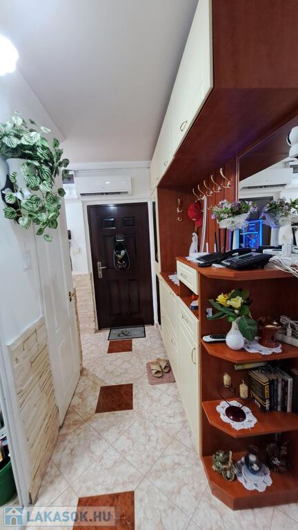 A lakás műanyag nyílászárókkal, redőnyökkel, biztonsági bejárati ajtóval felszerelt, felújított fürdőszobával és külön WC-vel várja új tulajdonosát. A konyhában beépített, gépesített konyhabútor található, amely – csakúgy, mint a többi helyiségben lévő beépített szekrények – a vételár részét képezi.