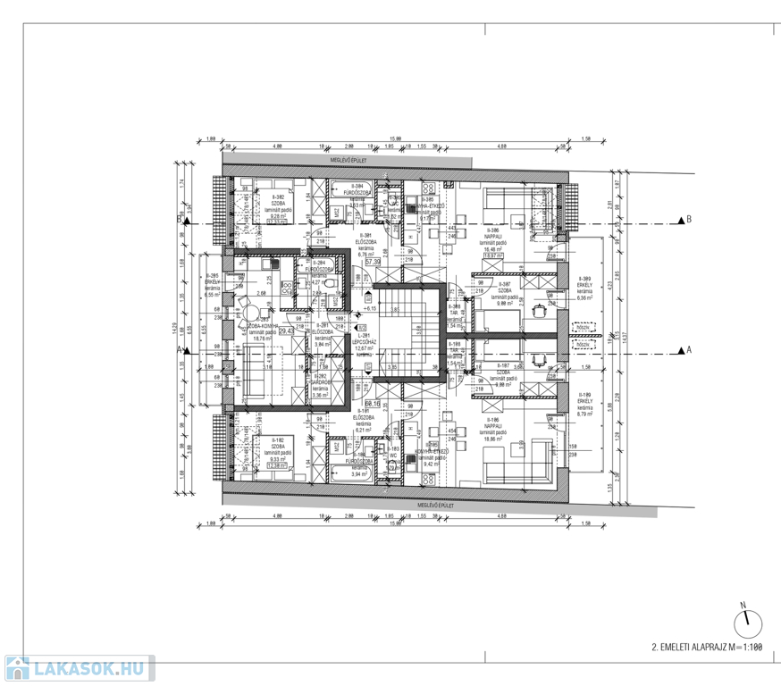 1/3 lakás: 62,91 m2, nappali + 2 szoba, tároló, erkély (6,05 m²), terasz (4,05 m²). Egyedi gázfűtés, padló fűtés. Ára: 68.200.000 Ft